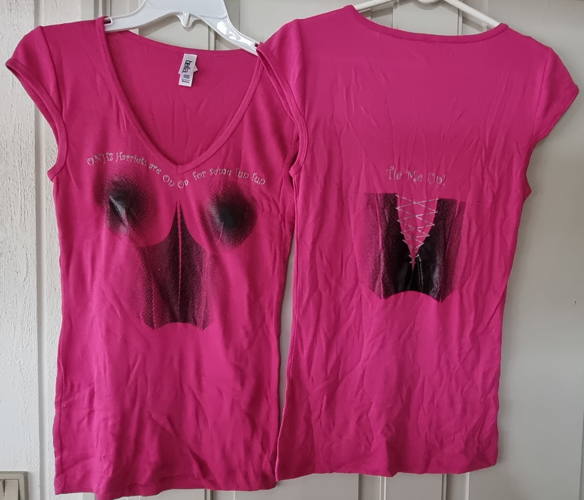 Pink korset t-shirt m. meget lille ærme4 stk M, 2 stk L.Pris 50kr pr. stk.